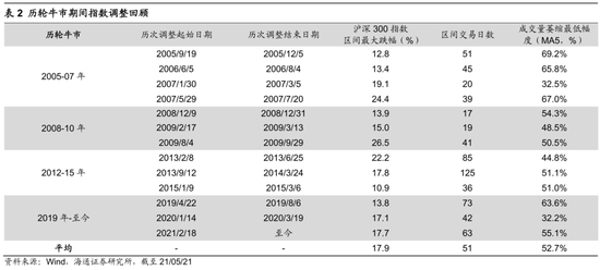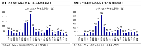 参考历史年度振幅,今年指数再创新高概率偏大。统计A股各主要股指在2000-2020年间每一年的振幅(年内最高价相对最低价的涨幅),上证综指2000年以来年振幅基本都在25%以上,在大牛市或熊市的时候指数的振幅会更高,年振幅平均为61%(中位数43%),其中仅2017年振幅小于25%,只有14%,主因这一年市场结构性特征明显,以上证50为代表的价值股全年涨幅25%,而以创业板指为代表的成长股全年下跌-11%。今年至今(截至20210521,下同)上证综指振幅只有12%,比2017年还小。如果用沪深300指数衡量,2002年沪深300设立以来年振幅大部分时间在30%以上,平均振幅为69%,中位数46%,但今年只有21%;如果用万得全A衡量,2000-2020年间指数年振幅大部分时间也在30%以上,平均70%,中位数45%,但今年只有15%。今年上证综指的低点是3月9日的3328点,沪深300在3月25日的4883点,万得全A在3月9日的5071点,如果前期低点有效,那参考历史股指的波动幅度,今年股市还有进一步向上拓宽的空间。我们认为,前期低点是有效低点的概率较大,2月18日之后的下跌反映了市场对通胀上行、货币政策收紧等担忧,目前看,最悲观的预期可能正在过去。