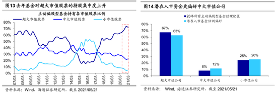 市值结构上,中大市值公司更优。春节后茅指数大幅下跌引发了部分投资者对今年市值风格的担忧,而我们认为,2017年以来超大市值(总市值800亿以上)个股表现占优,源于经济转型期龙头业绩更优+机构化加速带来龙头估值溢价,去年疫情冲击基本面+天量基金发行加速了这一趋势。这些趋势性的因素至今没有改变,春节以来代表超大市值的茅指数跑输,只是性价比的自我修正。随着疫情得到控制,后疫情时代经济逐渐步入正轨,以茅指数为代表的超大盘股在基本面上的相对优势不会像去年那么极致,我们测算超大市值公司21Q1归母净利润两年年化增速为15%,当前PE(TTM,整体法,下同)为29倍,中大市值(总市值200-800亿)分别为19%、27倍,小市值(200亿以下)为6%、46倍,中大市值个股业绩改善较为明显。此外,我们测算了潜在入市基金的市值偏好,目前全市场所有主动偏股型基金、潜在入市基金对于总市值800亿元以上超大公司的配置力度分别为67%/63%,200-800亿元中大公司为8%/12%,200亿元以下公司为25%/26%,中大市值公司更受到资金偏好。详见《茅指数忧虑的出路-20210426》。