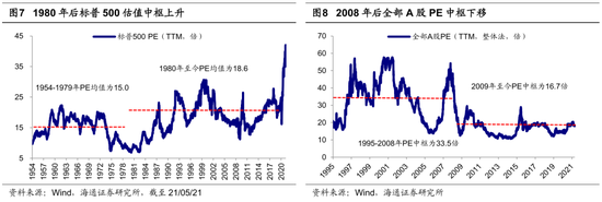 展望未来,A股估值中枢正在抬升中。除了企业盈利外,部分投资者还担心当前市场估值较高,今年货币政策较去年边际收紧的背景下,股市估值可能有压力。然而我们测算,当前A股估值实际上处于中位:从PE/PB看,目前(截至21/05/21,下同)沪深300PE(TTM)为14.2倍,处于处05年以来从低到高58%分位(08/10来为70%),PB(LF)为1.65倍,处05年以来从低到高44%分位(08/10来为55%),估值矛盾不算大。展望未来,站在中长期视角看,我们认为A股未来将类似1980年代之后的美股,估值中枢有望上移,这源于三个层面:①ROE上行。1980年以来美国虽然宏观经济增速放缓,但产业结构升级加速,最终企业盈利保持高增长。当前我国经济步入高质量发展阶段,产业结构升级步伐逐渐加快,工程师红利正快速形成, 5G、新能源技术等领域已经取得一定优势,以智能制造为代表的高附加值制造业正快速崛起,A股ROE中枢有望上升。②利率下行。1980年代后美国GDP增速放缓带动利率下行,2008年以来我国名义GDP增速中枢已处在下移趋势中,预计利率中枢也会下移。③居民资产配置转向。我国产业结构正经历从工业主导转向信息+服务业主导的转变,整个社会的融资结构将从以银行信贷为主导转变为以股权融资为主导;同时,我国人口结构随着人口年龄中位数的提升而发生变化,居民住房需求将逐渐饱和;在产业结构和人口结构变化的影响下,我国居民资产配置中权益比例有望上升。因此综合来看,目前沪深300 14倍的PE和1.7倍的PB并不贵。