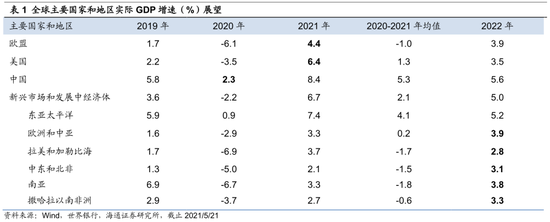 那什么时候经济进入滞胀期?我们认为要看何时通胀开始大幅上行,而这要看疫苗接种进度和全球经济复苏情况,在上周周报《通胀前期盈利上、股市涨-20210516》中我们指出,疫情下全球经济的复苏与08年之后的复苏不同,这次的复苏是分批的,我国去年下半年复苏,美欧今年复苏,而其他新兴市场国家可能要等到明年。根据世界银行预测,2021年我国实际GDP增速为8.4%,那么2020-21年两年年化增速将达5.3%,与疫情前2019年的5.8%相差无几。但世行预计2021年美国实际GDP增速为6.4%,欧盟为4.4%,对应两年年化增速和19年增速分别为1.3%(2.2%)、-1.0%(1.7%)。相比之下,世行预测大部分新兴市场国家2020-21年GDP年化增速为负增长,要等2022年才能恢复疫情前的水平。在这种复苏背景下,我们认为今年PPI的高企是基数原因导致的,真实的基于经济周期运行的通胀压力可能明年才会显现,届时经济才会进入滞胀期。明年上半年将是一个重要的观测窗口期,重点关注海外需求复苏对商品价格的影响。