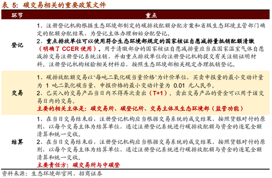 本次的三个文件主要涉及登记、交易、结算的细节,文件中明确了CCER的使用、碳配额采用T+1交易方式以及相关行为主要责任方等。