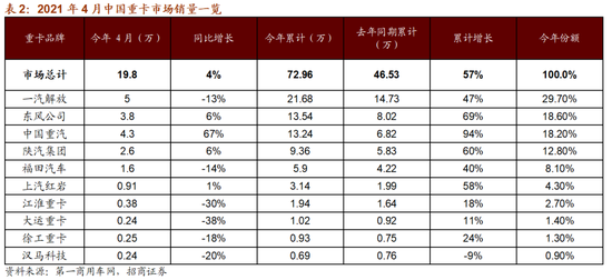 4月重卡销量再次刷新历史同期记录。据第一商用车网数据,2021年4月国内重卡销售约19.80万辆,同比增长4%,相比2019年同期增长66.67%,创重卡市场4月份销量的历史新高,也是重卡市场自去年4月份以来的13连增。前四个月重卡累计销量达到73万辆,同比上涨57%。细分企业来看,有5家企业销量破万辆,销量前十企业4月份合计份额达到98%,而排名前五的企业合计份额达到87.4%,其中排名首位的一汽解放独食了3月份重卡市场29.7%的份额。