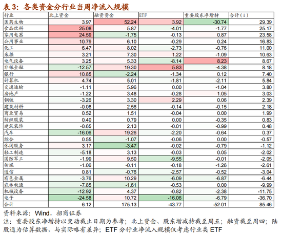 【资金·众寡】融资资金持续大幅流入,陆股通加仓消费。北上资金本周净流入4.75亿元,较前期下降;融资资金前四个交易日合计净流入171亿元;新成立偏股类公募基金27亿份,较前期明显下降;ETF转为净赎回,对应资金净流出43亿元。行业偏好上,北上资金买入较多的为食品饮料、家电等;融资资金净买入较多的为医药、非银金融、汽车等;医药和券商ETF申购较多。重要股东二级市场净减持规模下降,计划减持规模扩大。