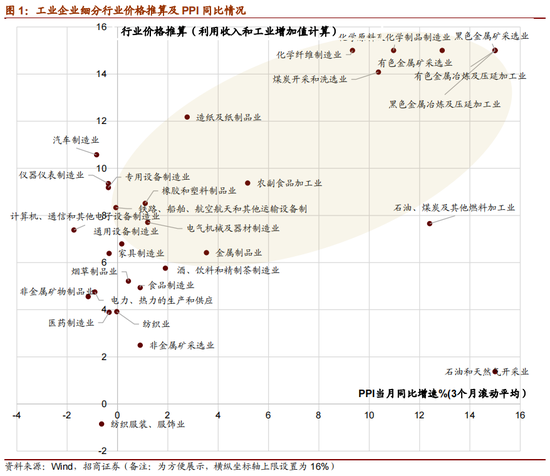 综合PPI同比以及行业价格倒推值(利用营收和工业增加值等指标倒推行业价格变动情况),价格提升较为明显的行业集中在上游资源品/采矿业(煤炭开采和洗选业、黑色金属/有色金属/非金属矿采选业、化学原料及化学制品制造、黑色/有色金属冶炼及压延加工、化学纤维制造);2021年初以来,在大宗商品需求持续好转供给端相对受限的作用下,南华工业品指数上行幅度接近15%,部分供需格局较好的品种价格上行更为迅猛。对于上游资源品而言,其盈利能力与产品价格具有极高的正相关性,同时资源品板块成本和费用端相对固定(如固定资产折旧费用较为稳定)。在中下游需求持续向好时,上游资源品往往可以实现顺利提价。