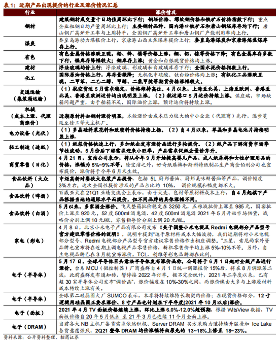 本文参考行业中观景气度以及公司发布涨价函情况,梳理了近期已经出现明显提价行为的行业。主要集中在以下几个方面: