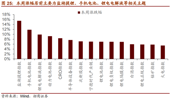 本周市场上涨,Wind全A指数周度上涨0.49%,创业板指上涨2.62%,沪深300上涨0.46%。本周涨幅居前的主要为盐湖提锂、手机电池、锂电电解液等相关主题。
