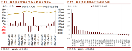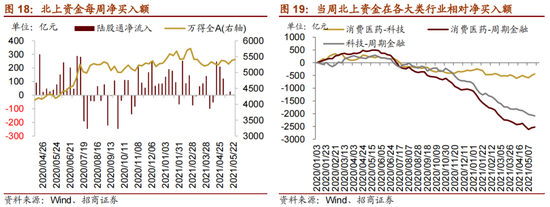 本周(5月17日~5月21日)北上资金小幅净流入4.75亿元。行业偏好上,北上资金净买入规模较高的为食品饮料、家电等,分别净买入25亿元、24.6亿元;主要净卖出电子、汽车、机械设备等。如果从大类行业来看,本周北上资金各大类板块的相对净买入额排序为消费医药>周期金融>科技。