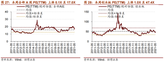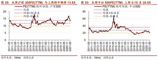 本周全部A股估值水平上涨。截至5月21日收盘,全部A股PE(TTM)上涨0.1X至17.0X,处于历史估值水平的63.5%分位数。创业板本周上行,PE(TTM)上涨1.0X至47.4X,处于历史估值水平的47.8%分位数。代表大盘股的沪深300指数PE(TTM)与上周持平,维持在13.6X,处于历史估值水平的80.7%分位数。代表中小盘股的中证500指数PE(TTM)上涨0.1X至20.5X,处于历史估值水平的15.0%分位数。
