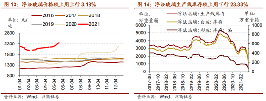 近期玻璃价格持续上行,浮法玻璃生产线库存、白玻璃和彩玻璃库存均下行。在价格方面,截至5月21日,全国主要城市浮法玻璃现货均价较上周上行3.18%至2358.45元/吨。库存方面,截至5月21日,浮法玻璃生产线库存较上周下行23.33%至1364.0万重量箱;白玻璃库存较上周下行22.33%至1265万重量箱;彩玻璃库存为66万重量箱,周环比下行34.00%。