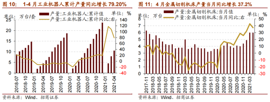 4月份工业机器人产量当月同比增幅收窄。4月工业机器人当月产量为30,178台/套,当月同比增长43.00%,增幅较3月缩小37.80个百分点,当月产量相比2019年同期增长133.63%。2021年1-4月工业机器人累计产量为105,439台/套,同比增长79.20%,增幅较2020年1-3月缩小28.80个百分点,累计产量较2019年同期增长132.97%。