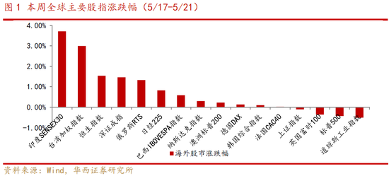 本周全球股指呈现分化。印度SENSEX30(+3.71%)、台湾加权指数(+3.00%)、恒生指数(+1.54%)、深证成指(+1.47%)领涨;道琼斯工业指数(-0.51%)、标普500(-0.43%)、英国富时100指数(-0.36%)回调。