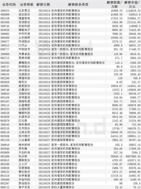 本周共有47家公司限售股陆续解禁,合计解禁量33.81亿股,按5月21日收盘价计算,解禁市值为1110.23亿元,较上周解禁市值634.95亿元上升74.85%。