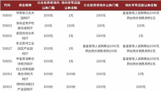 ? 首批基础设施公募REITs也对公众投资者的认购份额设了限制,最低门槛大致在100-1000元之间,追加认购金额在1-1000元之间。总体来看,场内认购以及通过基金管理人直销柜台单笔追加认购金额更高。