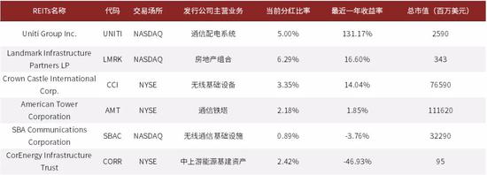 ? 具有良好的分红率: 美国基础设施和仓储物流REITs的平均分红率达到3.5%,高于美国股票分红率和美国十年期国债利率。美国共有6只基础设施REITs,其中CCI、AMT、SBAC主营无线通信业务,UNITI主营通信配电业务,CORR主营中上游能源基站业务,LMRK主营房地产组合的投资经营。6只REITs分红比率差异悬殊,UNITI和LMRK分红比率达到5%及以上,而经营无线通信和能源基站的4只REITs分红比率较低,最低的SBAC仅有0.89%。