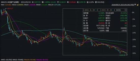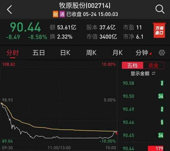 5月24日,3000多亿市值的“猪茅”牧原股份小幅高开后便一路下挫,午后盘中跌停。截止收盘报90.44元,全天成交超50亿元。华统股份、龙大肉食、新希望等跌超3%。