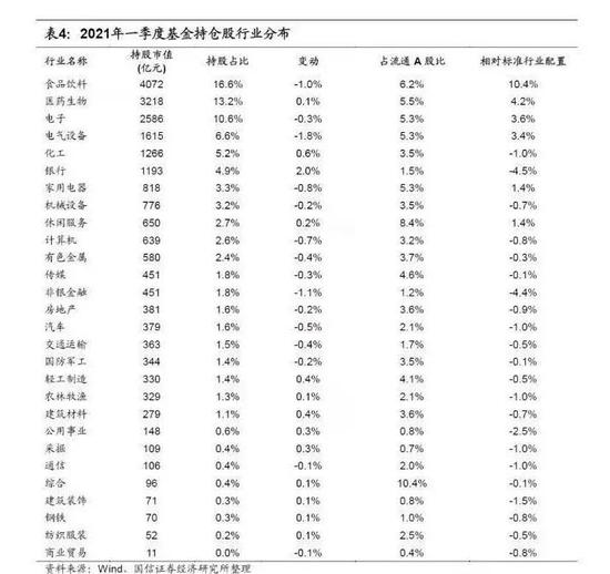 (1)从行业持股比例来看,2021年一季度食品饮料(16.6%)、医药生物(13.2%)、电子(10.6%)、电气设备(6.6%)和化工(5.2%)占比居前。而商业贸易(不足0.1%)、纺织服装(0.2%)、钢铁(0.3%)、建筑装饰 (0.3%)和综合(0.4%)持股占比仍然居后,均不高于0.5个百分点。