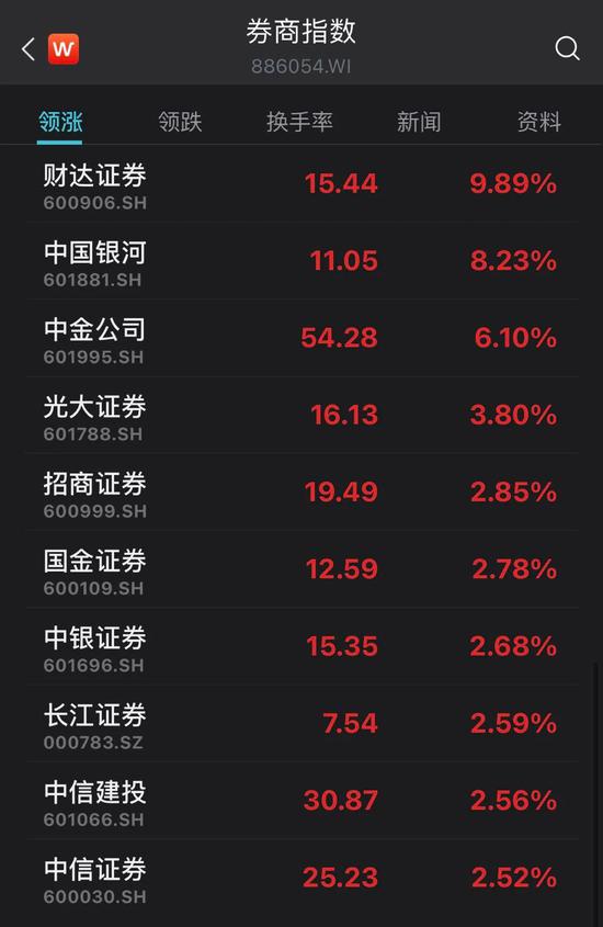 券商板块再度走强,截止收盘,中金证券涨超7%,中国银河涨超8%,中金公司、光大证券涨超3%。次新股财达证券尾盘拉升涨停,该股自上市以来已连续12个交易日涨停。