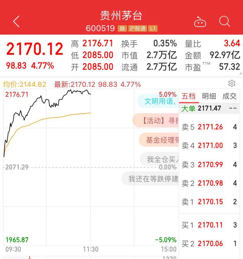 茅台上午股价暴增100多元,市值增加1000多亿元,高时达1300亿。
