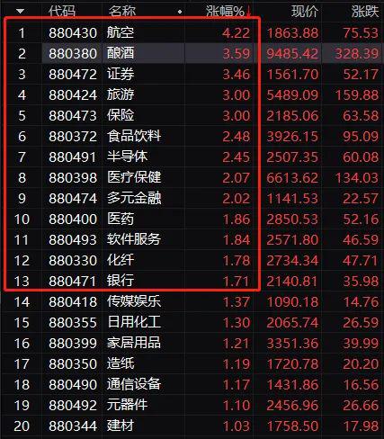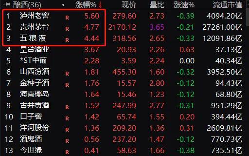 军工的航空股,酿酒当中的白酒股也都涨势强劲,航发动力盘中一度涨停。白酒股当中,一线白酒茅五泸涨幅领先,贵州茅台、五粮液盘中都涨超5%,到收盘分别涨超4%,泸州老窖大涨5.6%。