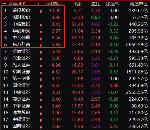券商股板块盘中一度涨近5%,老龙头中信建投盘中涨停,上午收盘哈投股份、湘财股份涨停,中信建投大涨超8%,中金公司、东方财富涨幅也较大。