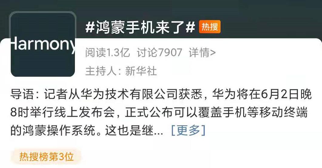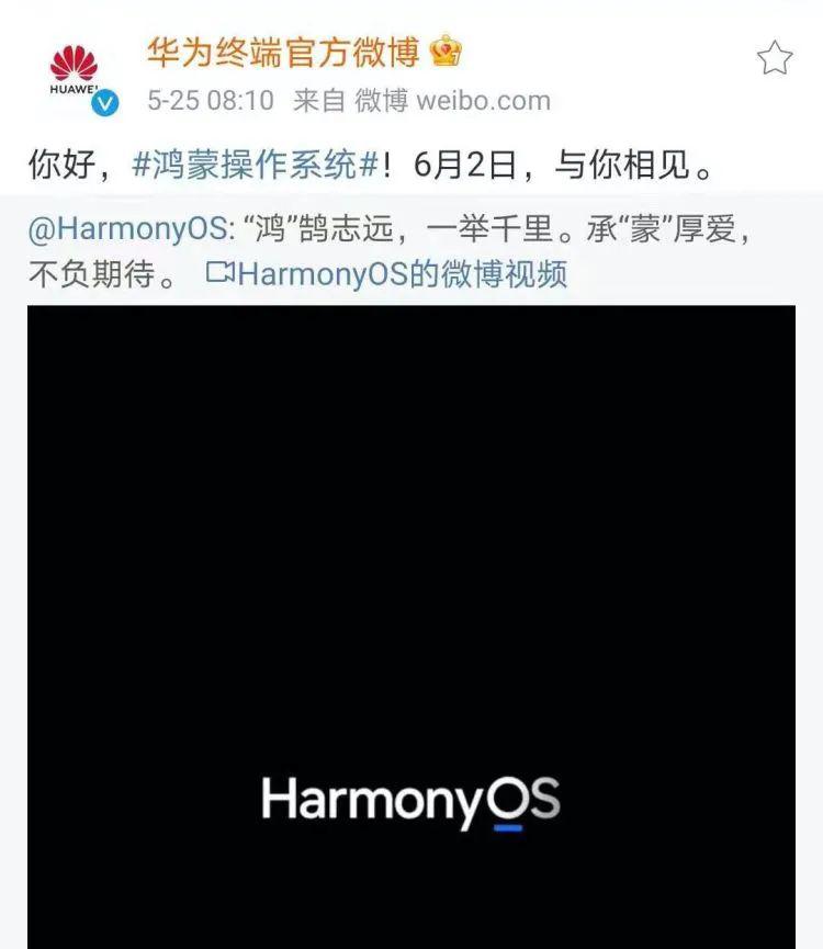 今天,重磅的消息是,华为宣布鸿蒙手机马上就要来了。华为5月25日公布,计划在6月2日正式举办鸿蒙产品发布会,华为公司官方微博25日发布鸿蒙手机操作系统开机画面视频。