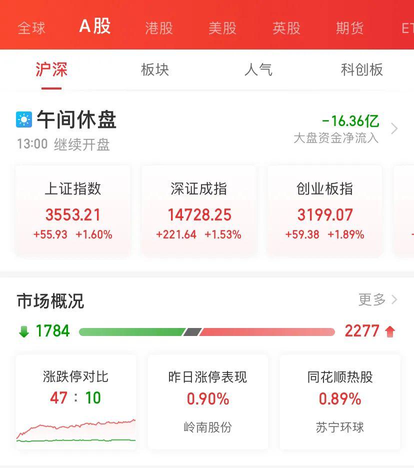 重磅股票齐发力,上午三大指数全线上涨,上证指数涨1.6%,深证成指涨1.53%,创业板指数涨1.89%,创业板指盘中涨超2%,两市成交额明显放大,上午成交6163亿元。上午2277只个股上涨,1784只下跌。