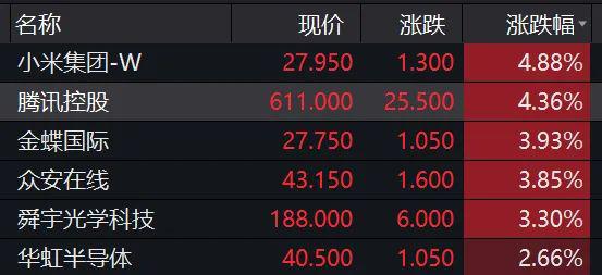 港股也涨得喜人,上午盘中恒生指数涨超1%,恒生科技指数也涨超1%,核心资产的腾讯控股大涨超4%,小米集团也涨超4%。