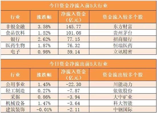 28个申万一级行业中,20个行业实现资金净流入,其中非银金融行业净流入145.77亿元居首。