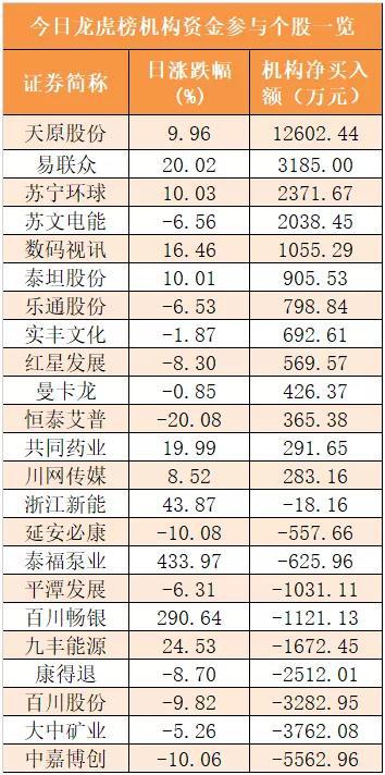 盘后龙虎榜数据显示,机构现身23股,其中天原股份等13股呈现机构资金净买入,中嘉博创等10股呈现机构资金净卖出。