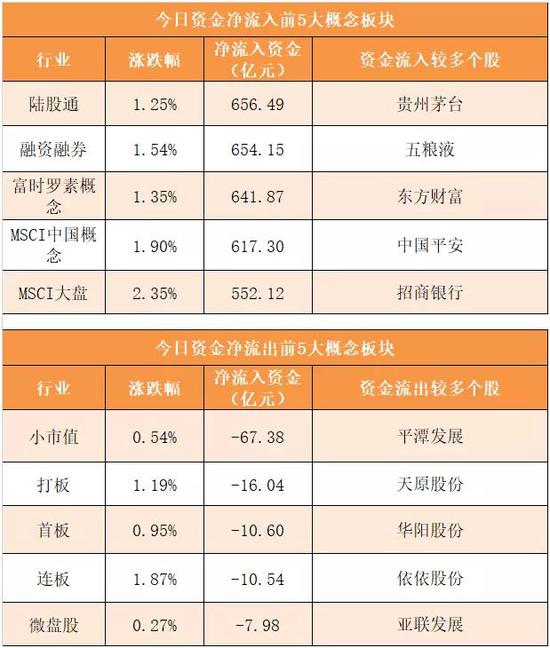 概念板块方面,今日陆股通、融资融券、富时罗素概念、MSCI中国等概念板块资金呈现净流入,其中陆股通概念净流入656.49亿元居首。