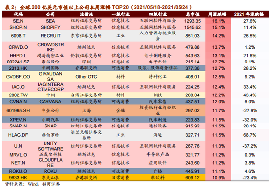 【全球股市表现】上周全球股市普涨,亚太市场领涨。美股方面,道指、纳指、标普500分别上涨0.2%、2.1%、0.8%。市场主要关注4月美联储会议纪要、加密货币监管以及全球疫情。美联储会议纪要方面,在4月19日公布的4月美联储货币政策会议纪要中显示,一些与会者建议,如果经济继续朝着委员会的目标快速发展,那么在“某个时分”讨论收紧其宽松政策是恰当的,这是美联储首次发出讨论收紧其宽松政策的信号。加密货币监管方面,各国政府发布若干关于加密货币市场的监管规则。美国规定从2023年开始,超过1万美元加密货币交易将需要向国税局报告。中国有关部门上周发布了《关于防范虚拟货币交易炒作风险的公告》,强调加密数字币不具备货币属性,金融机构、支付机构等不得开展与加密数字币相关的业务。全球疫情方面,上周印度、泰国、中国台湾、南美疫情持续恶化。印度成为继美国、巴西后第三个累计死亡病例数超30万例的国家。中国台湾地区自5月15日以来已连续十天新增本土病例超过100例,本岛18个县市出现本土病例。泰国总理巴育宣布将延长紧急状态法2个月至7月31日。行业表现方面,上周信息技术板块表现相对较好,材料、能源行业表现相对较差。异动股方面,过去一周大涨的200亿美元以上市值公司中,信息技术行业公司相对较多。过去一周领跌的200亿美元以上公司中材料、可选消费行业公司居多。