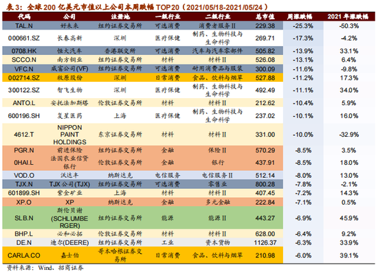 过去一周大涨的200亿美元以上市值公司中,信息技术行业公司相对较多。过去一周领跌的200亿美元以上公司中材料、可选消费行业公司居多。