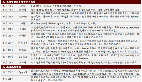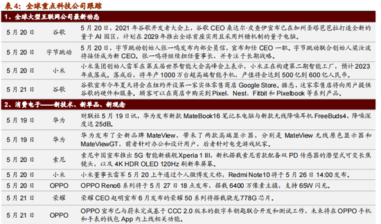 【重要资讯】SK Innovation、福特:SK INNOVATION表示将与美国第二大车企福特各斥资3万亿韩元在美成立动力电池合资企业“BlueOvalSK”,年产能有望达60GWh。华为:华为于5月25日正式官宣,计划在6月2日正式举办鸿蒙操作系统及华为全场景新品发布会,预计此前只用于智慧屏、可穿戴设备等上的鸿蒙系统,将在手机上使用。谷歌:5月20日,2021年谷歌开发者大会上,谷歌CEO桑达尔·皮查伊宣布已在加州圣塔芭芭拉打造全新的量子AI园区,计划在2029年推出全球首座实用且采用纠错机制的量子电脑。