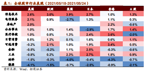 上周全球股市普遍上涨,亚太市场领涨。美股方面,道指、纳指、标普500分别上涨0.2%、2.1%、0.8%。市场主要关注美联储会议纪要、加密货币监管以及全球疫情。美联储会议纪要方面,19日,美联储公布了4月货币政策会议纪要。纪要显示一些与会者建议,如果经济继续朝着委员会的目标快速发展,那么在“某个时分”讨论收紧其宽松政策是恰当的,这是美联储首次发出这一明确信号。加密货币监管方面,上周各国政府发布若干关于加密货币市场的监管规则。美国财政部20号发布国税局改革提案,严查富人的隐藏收入,规定从2023年开始,超过1万美元加密货币交易将需要向国税局报告。中国有关部门上周发布了《关于防范虚拟货币交易炒作风险的公告》,强调加密数字币不具备货币属性,金融机构、支付机构等不得开展与加密数字币相关的业务。在此影响之下,上周比特币跌幅达到10.9%。全球疫情方面,上周印度、泰国、中国台湾、南美疫情持续恶化。5月24日,印度成为继美国、巴西后第三个累计死亡病例数超30万例的国家。中国台湾流行疫情指挥中心公布的数据显示5月15日本土疫情急剧升温以来,中国台湾地区已连续十天新增本土病例超过100例,本岛18个县市出现本土病例。泰国总理巴育21日主持召开新冠肺炎疫情管理中心会议并决定,泰国将延长紧急状态法2个月至7月31日。