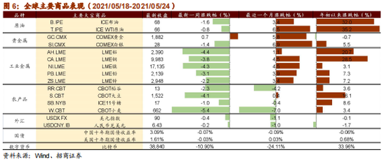 原油方面,上周布油下跌1.6%,WTI原油下跌0.8%。受伊核协议谈判影响,市场担忧解禁后伊朗原油回归市场将导致今夏原油供应增加。贵金属价格涨跌不一,上周金价上涨0.7%,银价下跌1.4%。随着中国加大金属价格管控以及美联储会议纪要提及缩减QE,工业金属全线下跌,金属铝、金属铜、金属镍、金属铅、金属锌分别下跌4.4%、3.8%、4.3%、3.1%、2.2%。农产品价格普遍下跌,稻谷、大豆、ICE11号糖、小麦分别下跌2.3%、4.1%、1.0%、5.4%。10年期美债利率小幅下跌至1.61%。美元指数下跌0.4%至90,人民币相对美元升值0.2%,当前人民币兑美元中间价为6.43。比特币价格上周持续大幅下跌,跌幅达到10.9%,主要原因为全球监管者们上周陆续出台对加密货币市场的相关监管规则。