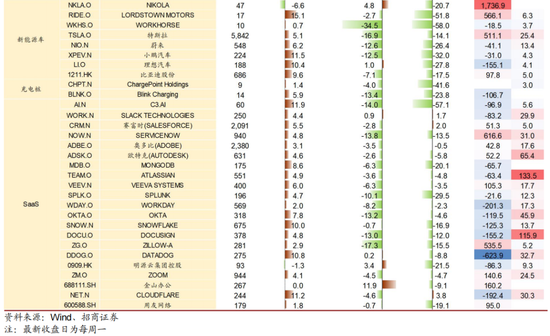 【全球产业趋势】趋势一:电动智能驾驶。5G+AI可能带来智能汽车的爆发,自动驾驶+新能源汽车或成为下一个十年新需求场景的创造源以及驱动全球经济效率提升的引擎。上周,美国总统拜登试驾福特新型电动皮卡F-15,并就其1740亿美元的电动汽车促进提案发表演讲,刺激美股电动车、充电桩等板块上涨。趋势二:SaaS。随着云计算技术的成熟以及5G技术渗透率的提升,万物云化的时代正在到来。美股一季报也印证了云计算板块的高景气度。上周,美股SaaS板块迎来集体上涨,其中涨幅较高的SaaS公司包括:服务工业领域(能源、军工)的企业级SaaS公司C3.AI,网络安全SaaS公司Cloudflare,应用程序监控服务SaaS平台Datadog,为企业提供云原生数据仓库的公司Snowflake等。