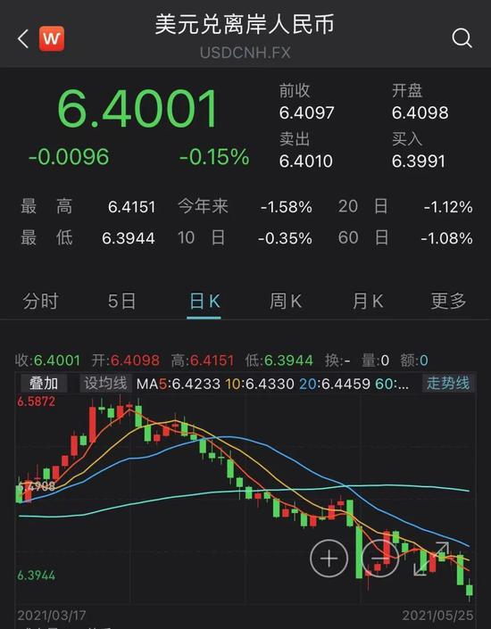 5月25日,离岸人民币兑美元午后扩大涨幅,升破6.4关口,创2018年6月来新高。