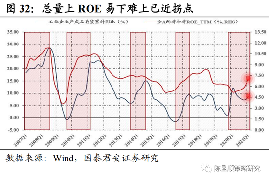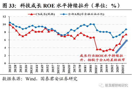 总量上ROE易下难上已近拐点,科技成长具备结构上的优势。通胀预期驱动补库进程,2007年来工业企业产成品存货累计同比与全A ROE的相关系数为0.74,值得注意的是,库存周期的弱化带动ROE中枢的下移,本轮总量上的ROE抬升或近尾声,后续需研判结构上的分化。成长行业的ROE水平正处于持续抬升通道,相较于全A的差距迅速收窄。历史数据来看,除2014-2015年的急速扩张时期,成长行业的盈利能力指标ROE水平相较于全A来说偏低,但2019年末以来,成长行业盈利能力领先于全A修复,ROE_TTM由2019年中的3.17%上升至8.74%,与全A的ROE水平逐步接近,边际改善的趋势和幅度均较为可观。