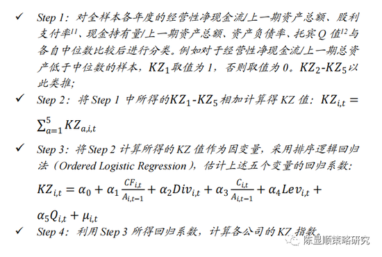 如果说宏观经济层面还可以兼顾到指标的领先性与前瞻性,那么微观财务层面我们更多的只能假设市场对其的风险评价相对稳定或约定俗成,在此前提下风险评价的度量可以向风险度量转化[1]。微观财务层面最大的风险便是企业的破产风险,我们以“全A Z值预警中值”表示。“Z值预警”由纽约大学Altlan教授创立,通过对1946-1965年间的33家破产企业和33家正常经营企业的财务数据,建立被普遍用来分析与判别上市公司、非上市公司和跨行业的财务预警体系。而后Kaplan and Zingales (1997)又借鉴该思路提出了著名的用以衡量公司融资约束程度的KZ指数,其构造方法如下: