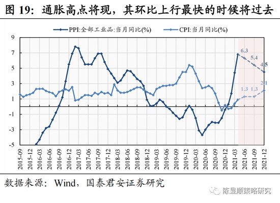● 通胀预期不确定性下行:高点将现,年内PPI高点难以超过5月份,其环比上行最快的时候将过去。尽管4月国内通胀如期冲高,PPI同比增速达6.8%,5月PPI预计将继续冲击年内新高。但往后看基于镜像影响、历史波动特征与阶段性供需错位三维度,通胀并不具备持续性。根据国泰君安研究所宏观团队预测,PPI年内第二个高点预计将出现在三季度末,但会低于5、6月的高点,通胀环比上行最快的时候将过去。
