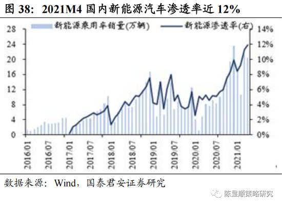 新能源车:材料涨价持续,正极与电池随产能抬盈利。2021M4国内新能源汽车销量同比增长180.3%,渗透率达11.9%,超过2020年12月单月8.8%的峰值。从2021M5的排产情况看整体保持状况良好,修复趋势确立。在国内几乎无补贴扰动情况下,优质供给即为需求。未来随着小鹏P5/宏光MINI/野马Mustang Mach-E/极氪001等越来越多的优质供给出现,市场需求将进一步被激发,全年来看预计国内销量将突破220万辆,欧洲方面2021M4同样表现亮眼。同时在碳排放的压力下预计欧洲市场全年销量将达200万辆,2021年新能源汽车的全球销量或将突破460万辆。六氟磷酸锂和添加剂环节供不应求支撑行业景气。2021Q1正极材料整体盈利表现亮眼,单吨盈利水平改善,后续随着产能的打满与自供比例的抬升,盈利依旧向好。电池方面,预计2021H2销售将陆续放量,磷酸铁锂、三元软包与方形均展现出较强的客户集中态势。