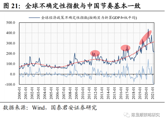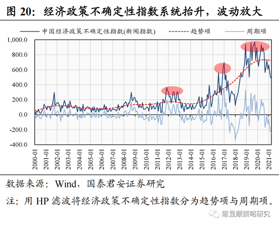 2010年以来中国经济政策不确定性指数系统性抬升同时波动逐步放大,尤其是2018年以来指数达到了历史高位。从中国经济政策不确定性指数的趋势项与周期项来看,趋势项2014年前均保持平稳,但自2014年开始进入上行区间,不确定性指数出现系统性抬升。同时周期项波动在逐渐放大,2010年以来中国经济政策不确定性指数出现三次明显的波动周期,分别出现在2011-2012年、2016-2017年以及2018年至今,波幅逐次提升。此外考虑到全球经济政策不确定性指数(按购买力折算GDP加权平均)波动虽较中国经济政策不确定性指数相对收敛,但节奏基本一致,故下文我们先以中国经济政策不确定性指数为主进行历史复盘。