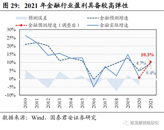 与此同时,随着风险评价下行与全球经济复苏,银行存在修表动能,同样具备较优投资机会。从国君策略风险评价指数与商业银行不良贷款率的关联程度来看,2016年之后风险评价指数下行阶段商业银行不良贷款比率均维持走平或下行的趋势,每一轮不良率上升期风险评价往往上行。此外,全球经济复苏背景之下金融行业盈利弹性值得期待,根据调整后的Wind一致预期增速,2021年金融行业预测增速可超过10%实现双位数增长。因此在盈利具备弹性+资产负债表修复的双重背景下,银行股的行情值得期待。