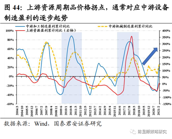 目前通胀压力即将见高点,在量骤升、价缓升的第三阶段,成本传导是大制造板块盈利的考量重心。2016-2017年供给侧改革及外需拉动涨价,但需求疲弱导致成本传导不足。而2020-2021年在内外需共振下,投资-利润(企业部门)-收入-零售(私人部门)的传导更为通畅,外需强劲下呈现“量价齐升”、“量缓升、价骤升”、“量骤升、价缓升”的三阶段演绎,当前演绎到第三阶段,中游制造机会凸显。