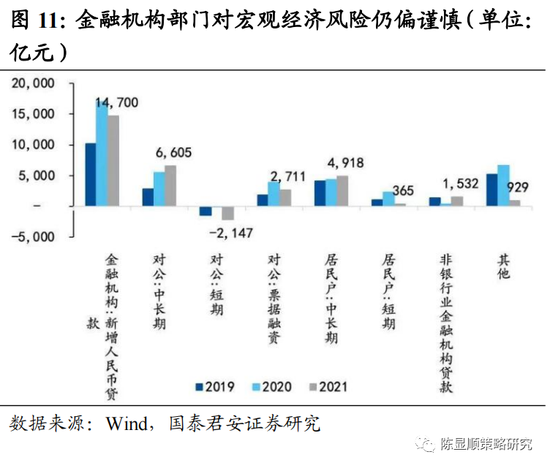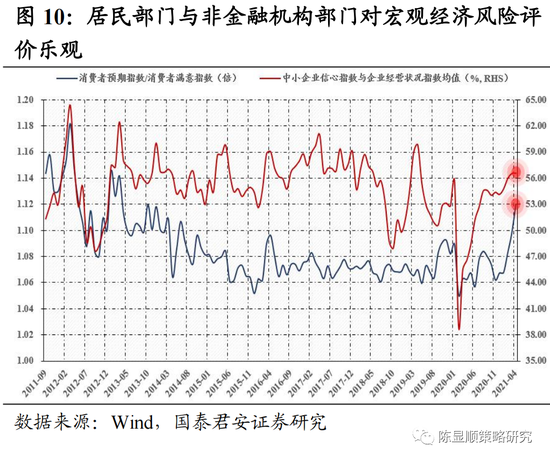 经济政策不确定性指数更多地反映宏观经济中政府部门的宏观经济风险评价,相应地,居民部门、金融机构部门与非金融机构部门的宏观经济风险评价分别使用“百度搜索指数:找工作+招聘+招工信息+失业金领取条件”、“消费者预期指数/消费者满意指数”、“中小企业信心指数与企业经营状况指数(BCI)均值”、“新增居民短贷与对公短贷/新增人民币贷款”加以简单代理。“百度搜索指数:找工作+招聘+招工信息+失业金领取条件”反映要素市场中的供需关系,是居民收入的一个侧面,居民的当期收入及对未来的收入预期会影响其消费、投资行为;“消费者预期指数/消费者满意指数”直接度量了未来6个月消费者的边际消费倾向(MPC)较现在更高还是更低;“中小企业信心指数与企业经营状况指数(BCI)均值”将目光从商品市场的需求侧转向供给侧,观察厂商行为反推其内心的宏观经济风险评价;“新增居民短贷与对公短贷/新增人民币贷款”是金融机构部门对宏观经济风险的考量。作为调节社会总需求的核心,银行的信贷意愿会在一定程度上反映其对宏观经济的风险评价。一方面常用的不良贷款率、拨备覆盖率、资本充足率等银行的经营指标频率受限,另一方面在银行信贷额度受控及到期量较大的背景下,中长贷作为其资产池中相对安全且高收益的资产会天然受到青睐,因此新增信贷中的短贷占比较具说服力。事实上,短贷恰是2021M4信用数据向下超预期的核心拖累,表明金融机构部门对宏观经济风险仍持谨慎态度。