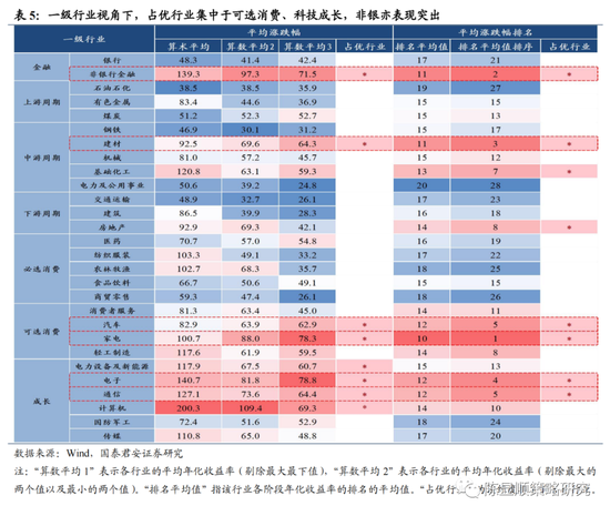 一级行业复盘:占优行业集中于可选消费、科技成长,非银亦表现突出。综合行业收益率绝对值与相对排名两个视角来看,可选消费中的汽车与家用电器行业、科技成长中的电子与通信行业、金融中的非银金融行业以及周期中的建筑材料行业均有优异的表现。此外科技成长中的电力设备与新能源以及计算机行业平均年化收益率亦靠前。