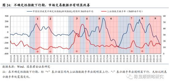 不确定性指数下行期,市场交易数据亦有明显改善。从上证指数换手率来看,在中国经济政策不确定性指数下行期,上证指数换手率在其中5阶段出现明显抬升,仅有2阶段换手率小幅下行,其余两阶段换手率震荡波动。从上证指数成交量来看,亦有相同表现。