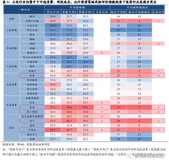 一级行业复盘:占优行业仍集中于可选消费、科技成长,此外国君策略风险评价指数视角下医药行业表现亦突出。综合行业收益率绝对值与相对排名两个视角来看,与中国经济政策不确定性指数相同的是,可选消费中的家用电器和汽车行业、科技成长中的电子行业均表现优异。此外国君策略风险评价指数视角下,医药、轻工和计算机的表现亦突出。