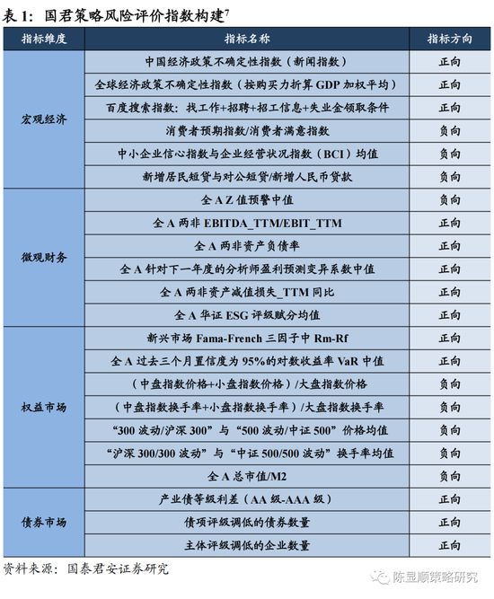 JamesMontier曾说“人们做决定时的关键因素是可信性而非逻辑性”,因此针对“风险评价”,尤其是“评价”二字的度量是极具挑战性的。国君策略基于对风险评价的定义、效应分析以及自身对权益市场的观察与理解,从宏观经济、微观财务、权益市场、债券市场四大角度选取22个指标,分别取其HP滤波(剔除趋势项)后的残差项的历史分位数合成风险评价指数。构建时我们尽量避免包括两融余额在内的更倾向于反映风险偏好的指标。