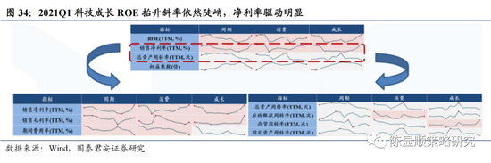 拆解细分行业盈利来看,2021Q1科技成长ROE的抬升斜率依然陡峭,且由净利率的驱动效应突显。2021Q1科技成长ROE为7.25%,抬升斜率依然陡峭,基本恢复至2018年水平,并且科技成长ROE主要由销售净利率驱动,盈利质量有保障。分行业来看,科技成长行业ROE环比6升1降,按照盈利能力改善幅度排序:医药>电子>传媒>计算机>通信>电力设备及新能源>国防军工(申万一级行业分类下新能源受传统电力设备拖累严重)。